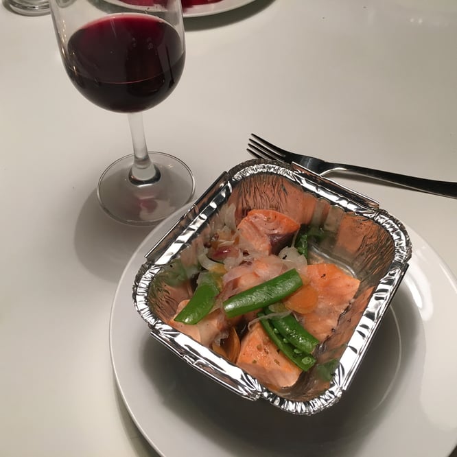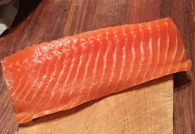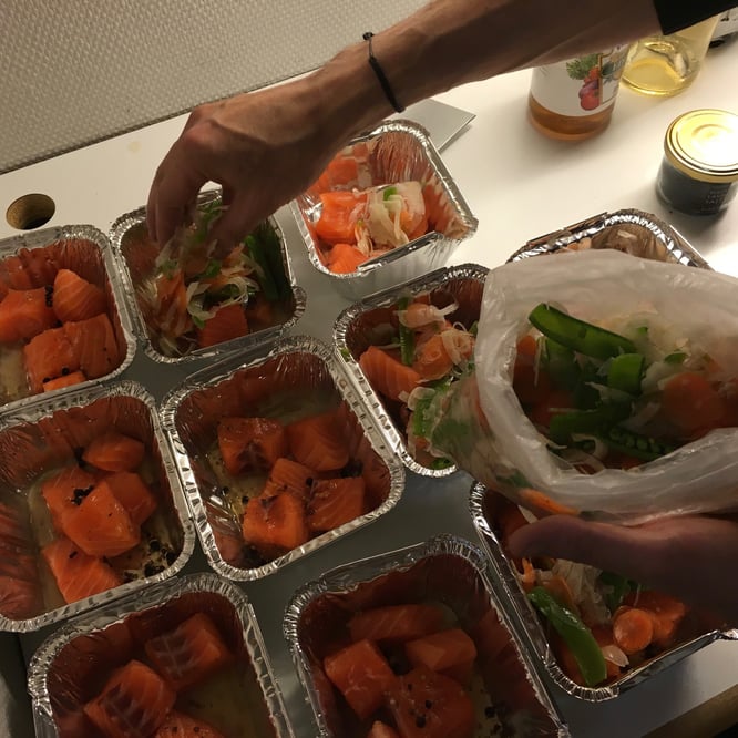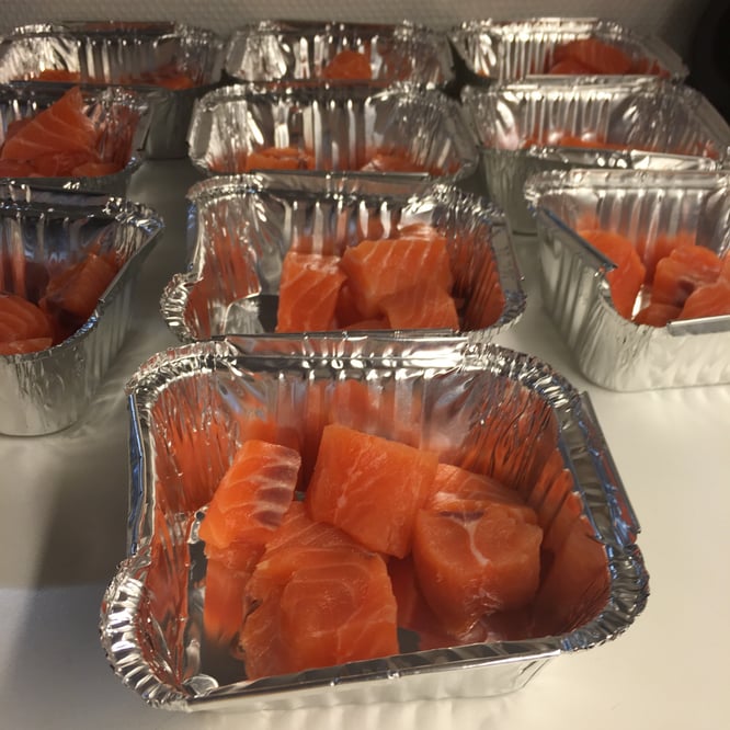 Laksestykkene ligger og venter. Noen former med alufolie finner jeg fort. I verste fall kunne jeg også brukt pappglass. I full fart rasker jeg også med meg en håndfull geniale ingredienser som skal bidra til festen.