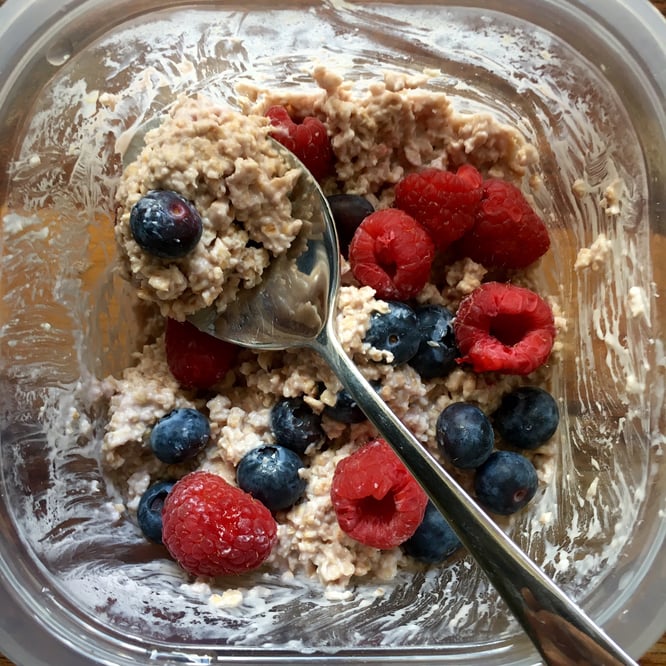 Du kan "koke" grøt i kjøleskapet natten over. Dritgodt med bær på!