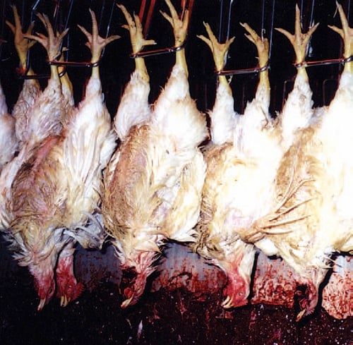 • På et stort slakteri i Valla slaktes det 195 000 kyllinger på én eneste dag. Dette skjer maskinelt, med 3,6 fugler i sekundet. Etter transport til dette slakteriet kommer det hver dag 6000 kyllinger i så dårlig forfatning at de må kastes.
