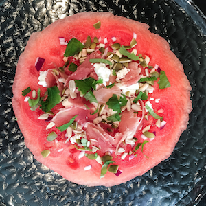 Her er den i én tykk skive, spritet opp med fetaost og spekeskinke, med rødløk, mynte og frøblanding.
