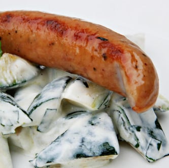 Vask og del squashen i tykke staver, skjær vekk den myke kjernen. Stek dem lett i litt smør, rør inn mel, crème fraîche, sukker og eddik. Smak til med salt og pepper, pluss hakket mynte. Server det lunkent.